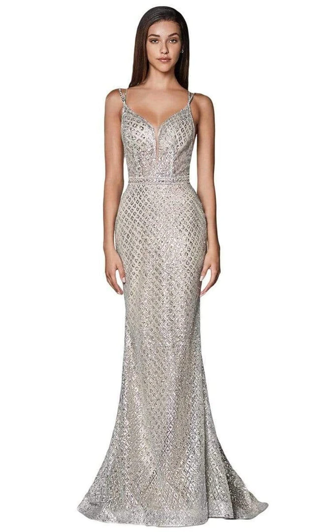 This figure-flattering evening gown showcases a fitted bodice with a plunging V neckline with sheer inset detail at the bust supported by dual spaghetti straps which leads to the open V back. The whole ensemble is designed in glitter which is certain to captivate attention from the crowd. The sheath skirt cascades to full length as it finishes with a small train.