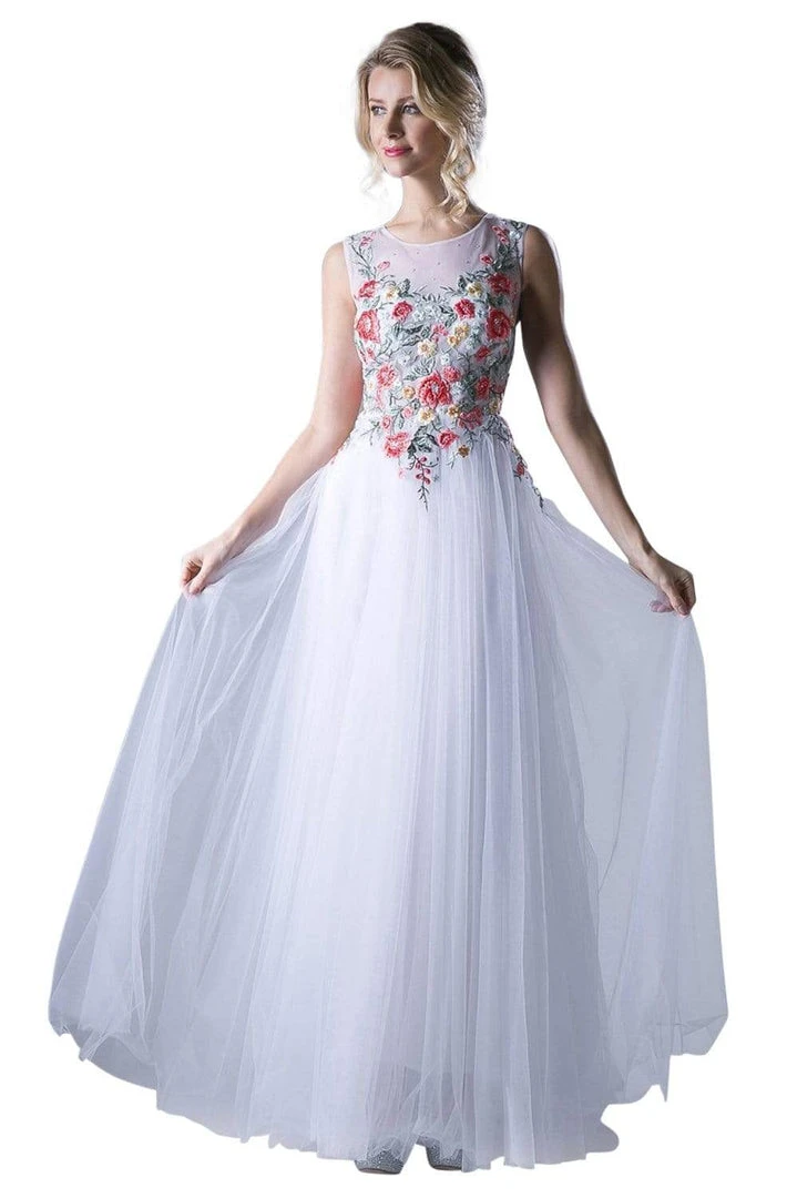 Look like a breath of fresh air when you glide in in this Cinderella Divine HW15 creation. Sewn in with a bouquet of blossoms along the bodice, this dress flaunts a jewel neckline atop a sprinkle of rhinestone-studs. Featuring a transparent full back and trailing florals around the waist, the A-line skirt flourishes gossamer tulle that touches the floor with a train. Dare to look extraordinary in this Cinderella Divine masterpiece.