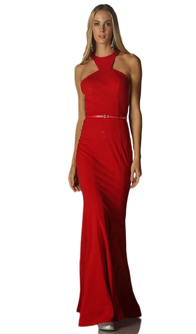 Show off your classy style when you wear this formal dress by Cinderella Divine CF076. This long dress features a sleeveless, halter neckline with fitted bodice framed in a thin belt. From the natural waist begins a full length sheath skirt. This Cinderella Divine dress is tailored to fit your curves.