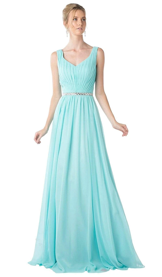 Make his eyes create with romantic sparks as he gazes on you in this stunning Cinderella Divine W0014 creation. Exquisitely ornate with radiating pleats along a sculpted sleeveless bodice, this charming piece shows off a low v-neckline paired with a shirred v-cut open back. Glistening with a bejeweled band, gentle pleats fall through down to the floor in a full-length A-line silhouette. Charm everyone with your splendid perfection in this delightful Cinderella Divine masterpiece. Models are wearing the Aqua, Black and Red colors.