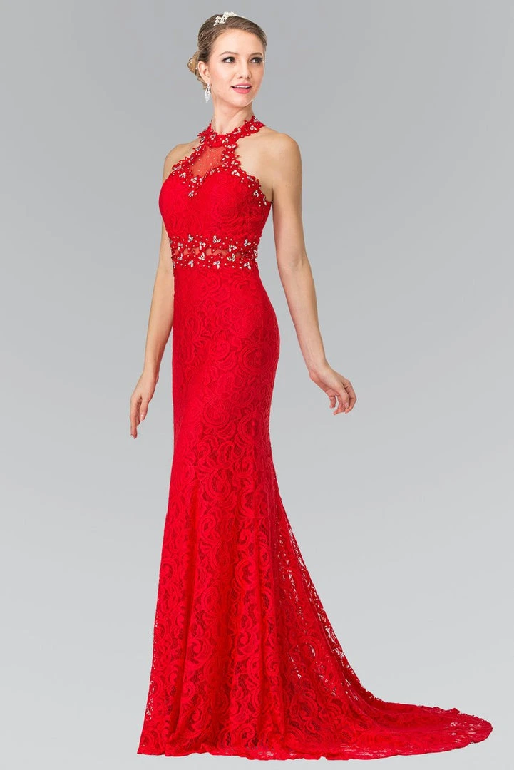Look sophisticated and wow the crowd in Elizabeth K GL2297. Shiny beads edged the halter neckline, formed the sweetheart bodice and embellish the entire back. Sheer panel encircle the waist giving the dress a sensational look. This Elizabeth K dress gives you a classy and fabulous look flowing into a romantic train.