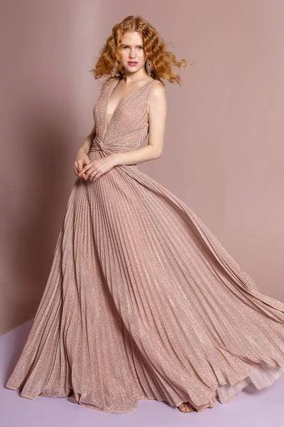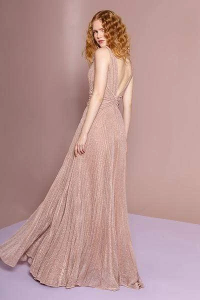 Made of lame fabric, this dress captivates in a sleeveless, deep V-neckline with a twisted ruched waist. The dress flaunts a low V-back and has a zipper closure. The skirt opens in an A-line silhouette and runs in full length hem.