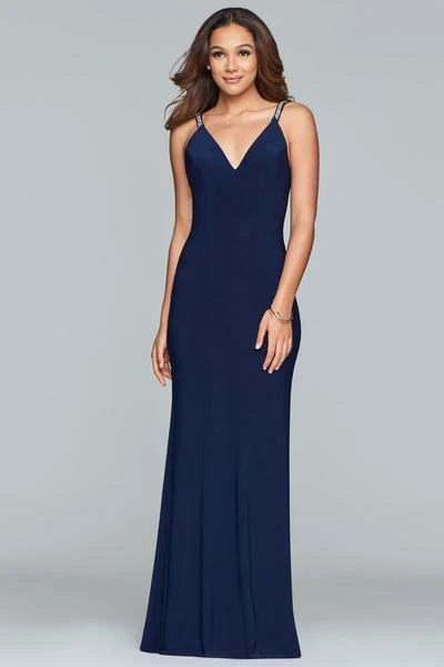 Flatter your figure with this stylish dress from Faviana S10267. This jersey dress features a sleeveless, V-neckline with embellished straps connecting to the criss-cross straps at the back. The fitted bodice forms a full-length sheath skirt. Look sophisticated and classy with this Faviana design. Model is wearing Navy color.