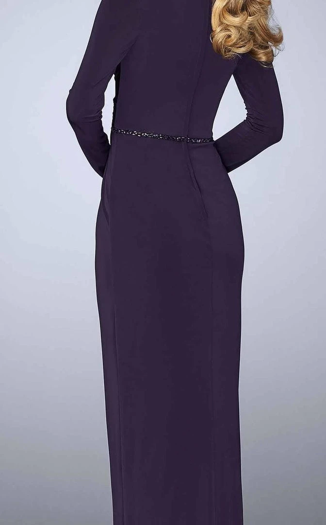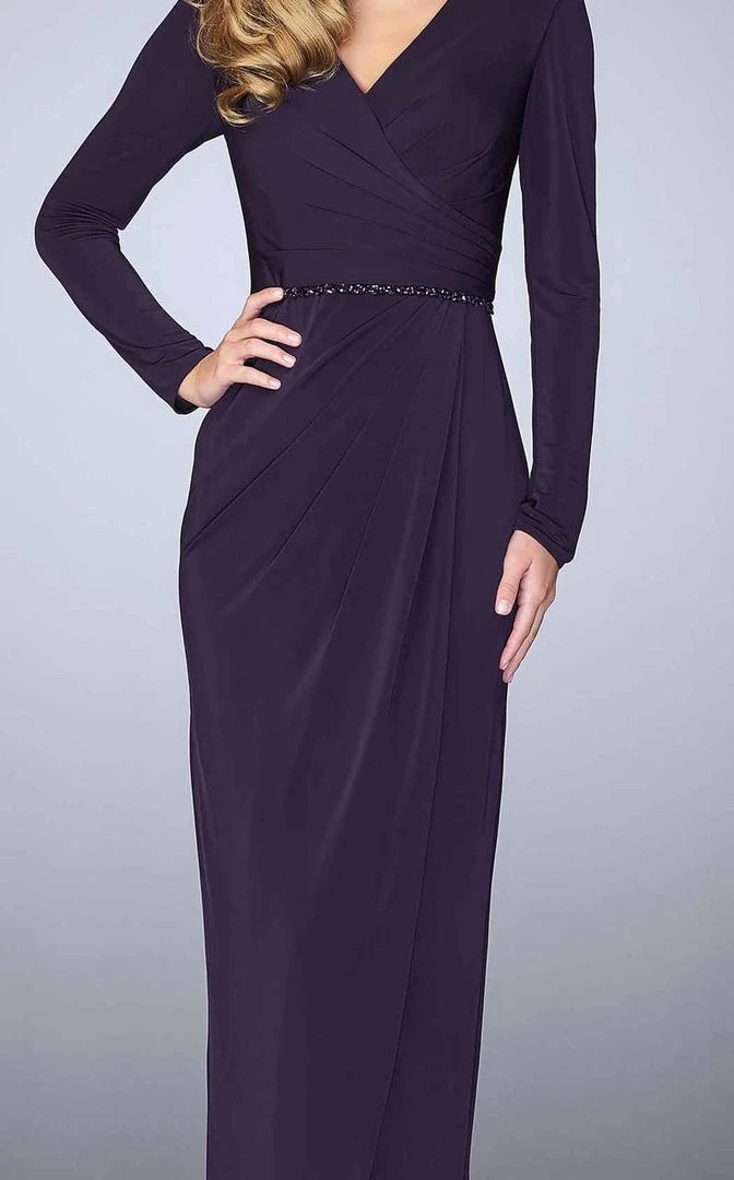 Fascinate from all angles as you make the most of every night in this fascinating La Femme 24927 creation. Beautifully styled in a soft jersey fabric, this gorgeous piece shows off an overlapped bodice framed with slender long sleeves and a full back. Crowned around the waist with thin shimmering band, the sheath skirt flaunts soft ruffles that cascades down in subtle movement as it completes at a tulip full length hemline. Craft a perfect night of celebration and promise while you flaunt your dazzling poise in this La Femme masterpiece. Model is wearing the Navy and Plum colors.