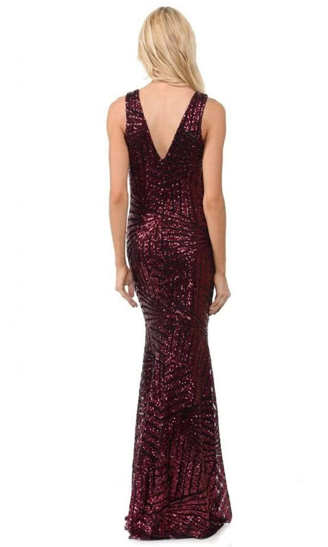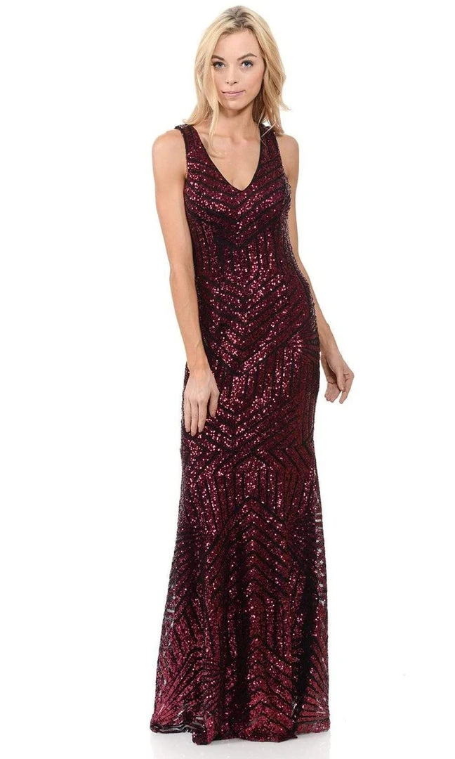 This stunning geometrical all over sequin gown features a sleeveless fitted bodice with V neckline and V shaped back. You are sure shine throughout this modified mermaid gown as it finishes at floor length hem.