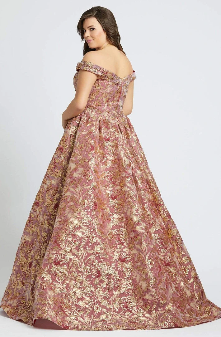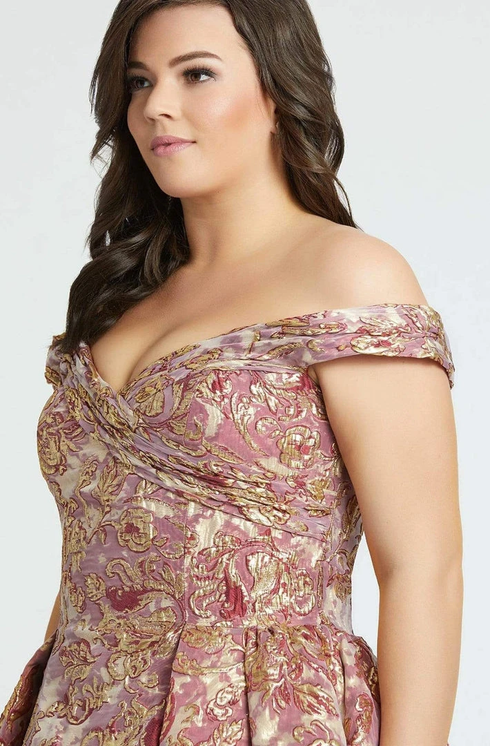 Look radiantly glowing in this gown by Mac Duggal Fabulouss 67613. This gown is designed with striking floral print details and allures in an off the shoulder neckline. From the waist opens a full length ballgown skirt with a dramatic sweep train. This Mac Duggal gown is a stunning look for your evening occasion.