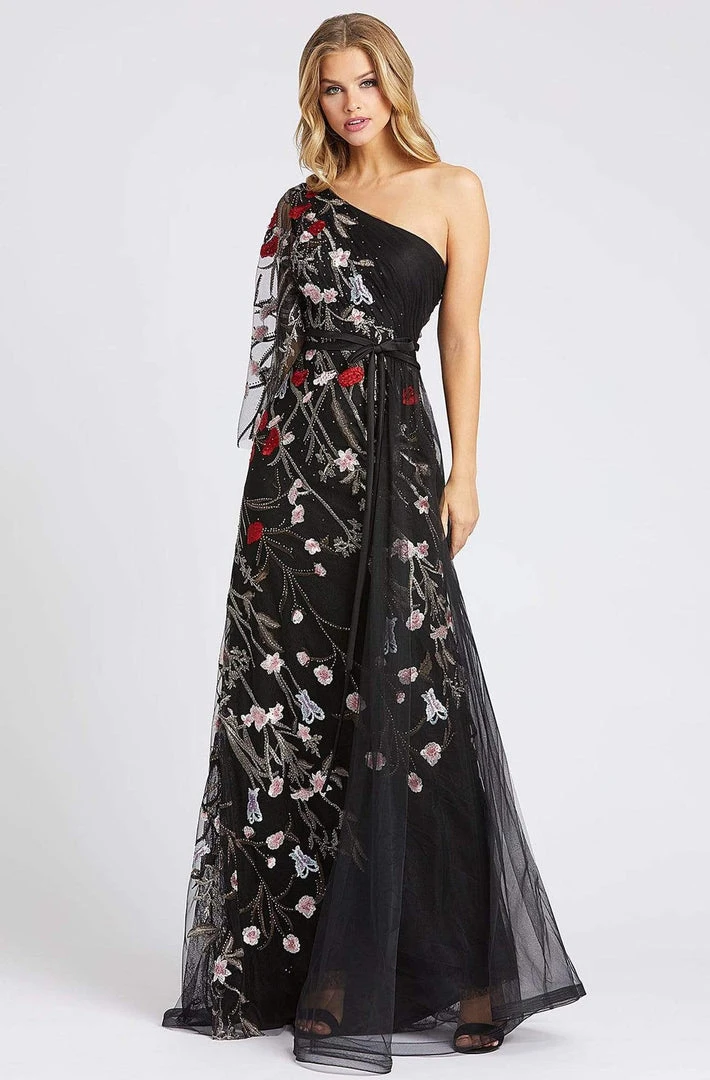 Be ready to capture the spirit of that romantic evening in Mac Duggal Couture 20124. Fashions an asymmetric neckline with fitted bodice designed with elegant floral embroidery. The waist is accented with double belt and the trumpet skirt is accented with a side train. Feel glamorous in this Mac Duggal piece.