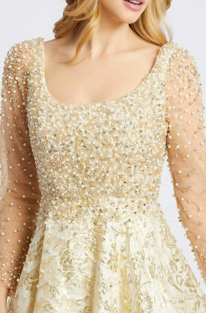 Feel like a real princess in this charming Mac Duggal Couture 66932 masterpiece. This lovely gold formal gown offers a beaded bodice framed with a scoop neckline and illusion long sleeves. The embossed metallic skirt highlights a ballgown silhouette with stunning pleats that cascades to full length. The back reveals a mid-scoop cut secured with a center zipper closure detail. Shine with the glow of ever after in this mesmerizingly tailored Mac Duggal ensemble.