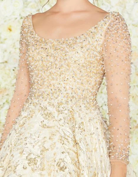 | Details: | Sheer Long Sleeves, Beaded Bodice, Pleated Skirt, Full Length, Scoop Back, Back Zipper Closure |