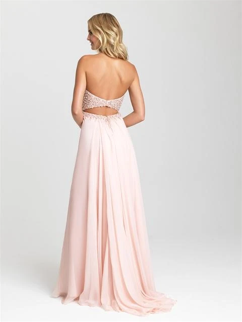 Finished with a pearlescent glow, this strapless chiffon gown is available in three pastel hues.