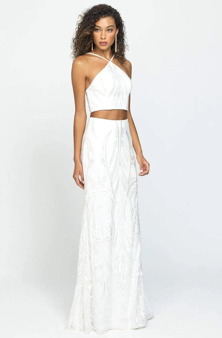 Feel like a queen in this fabulously ornamented Madison James 19-128 creation. Enticingly embroidered in a spectacular motif accented with shimmering sequins, this chic piece reveals an inverted halter neckline on a cut-in cropped top bodice. Framed with spaghetti straps connecting to a mid-open back, the elaborately ornate sheath skirt flows down to the floor with a sweep of train. Glow with a regal sophistication in this Madison James masterpiece. Model is wearing the White color.