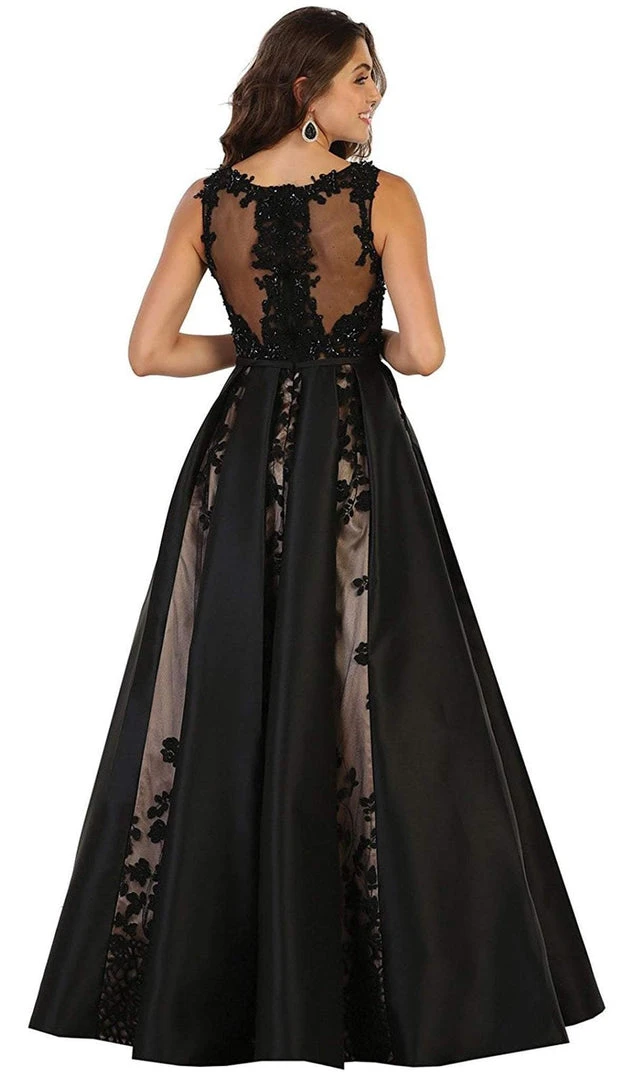 Set the tone for the night wearing this May Queen RQ7516 evening gown. Sleeveless, bateau styling with an illusion neckline debut the bodice while slender bow secure the center front. A trim fit details bust and midriff, and embroidered florals add sparkling adornment. Soft inverted pleats shape the expansive, full-length skirt for a fluttering finish. Flaunt your flair for fashion in this May Queen creation.