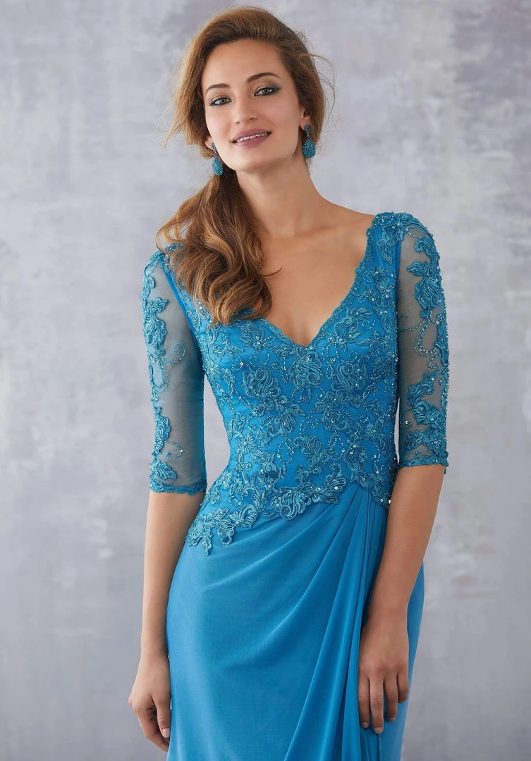 Enter the hall with grace and beauty in MGNY By Mori Lee 71728. This embroidered dress pleases a plunging V-neckline with sheer quarter length sleeves. The draped skirt runs in full length sheath silhouette. Walk in seduction and style in MGNY By Mori Lee.