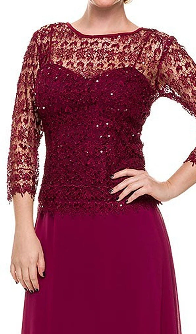 Look great at your next formal event wearing Nox Anabel 5083 Mother of the Bride Dress style. This dress features a lace overlay top with jewel neckline and quarter sleeve. Visible sweetheart inner-lay defines the fitted bodice. The skirt is smooth with a soft flared shape. This gown finishes with a full length hem. This elegant design by Nox Anabel looks good for any party or wedding event.