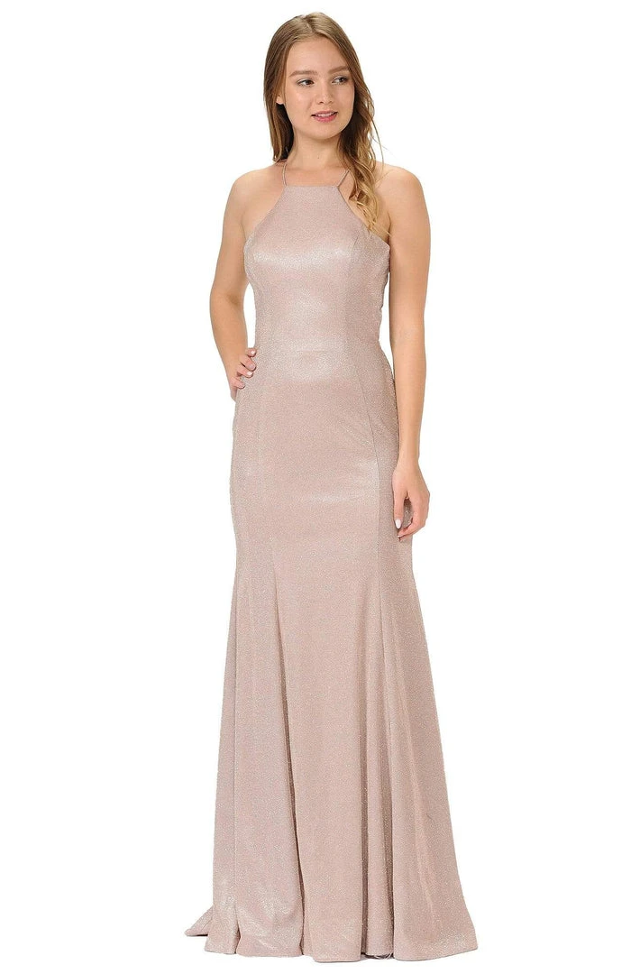 Flaunt your figure in this curve-hugging dress by Poly USA 8386. Tailored in glitter knit, this sleeveless piece mesmerizes in a halter neckline with spaghetti straps and fitted bodice. The back features a cropped racer cut style followed by a cutout at the lower back with center zipper closure. The skirt has a soft mermaid silhouette and brings drama with a subtle train finish. Make yourself into a vision of loveliness in this spectacular full-length dress by Poly USA.