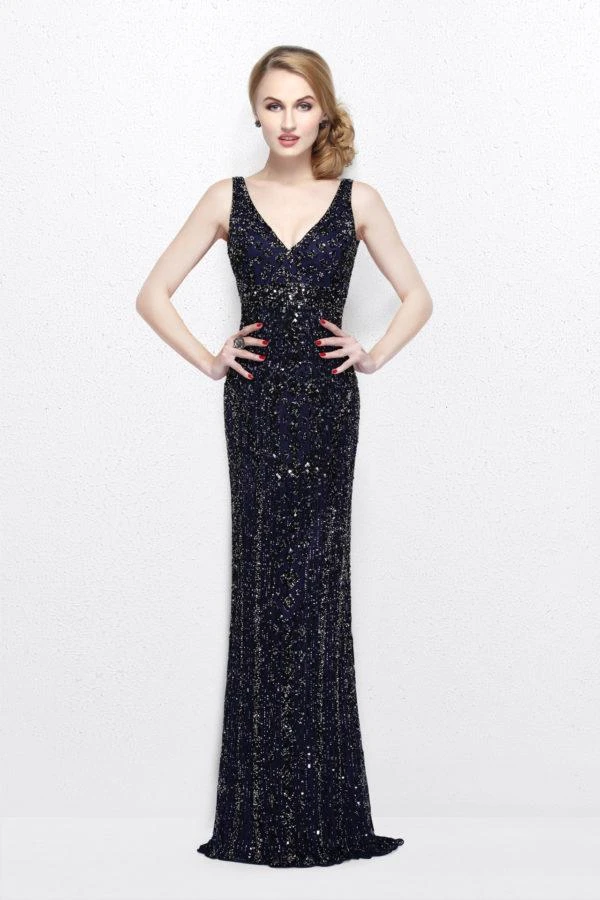 Sizzle and shine wearing this Primavera Couture 1734 evening gown. This sleeveless dress has a V-neckline and fitted bodice. Fine sequins stream throughout the gown for a look that shines with texture. The skirt has soft movement and finishes with a full length hem. Look attractive in this magnificent Primavera Couture creation.