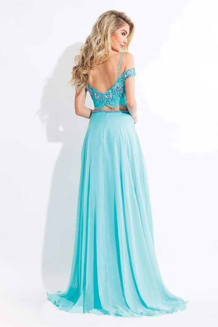 Exude lavish glamour as you own the red carpet wearing this spectacular Rachel Allan 6130 creation. Adorned with a vivid display of floral beadwork on an intricately scalloped hemmed top, this charming piece features a deep scoop neckline with dainty cap sleeves pairing with a low v-cut back. Embellished with a beaded thin waistband crowns the natural waist, the rich A-line skirt cascades in soft pleats before it completes with a sweep train. This two-piece gown includes a matching choker. Reap compliments as you make the crowd stare in awe in this gorgeous Rachel Allan masterpiece.
