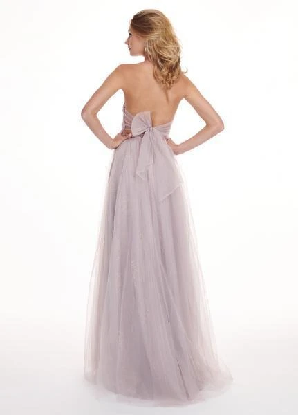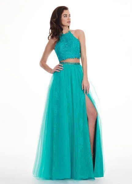 Wow everyone in this sophisticated dress by Rachel Allan 6437. This two piece ensemble enchants in a sleeveless, halter neckline crop top made of embroidered lace and accented with a bow at the back. The tulle A-line skirt runs in full length hem and is styled with a front high slit. Portray the rich variety in design of this Rachel Allan look.