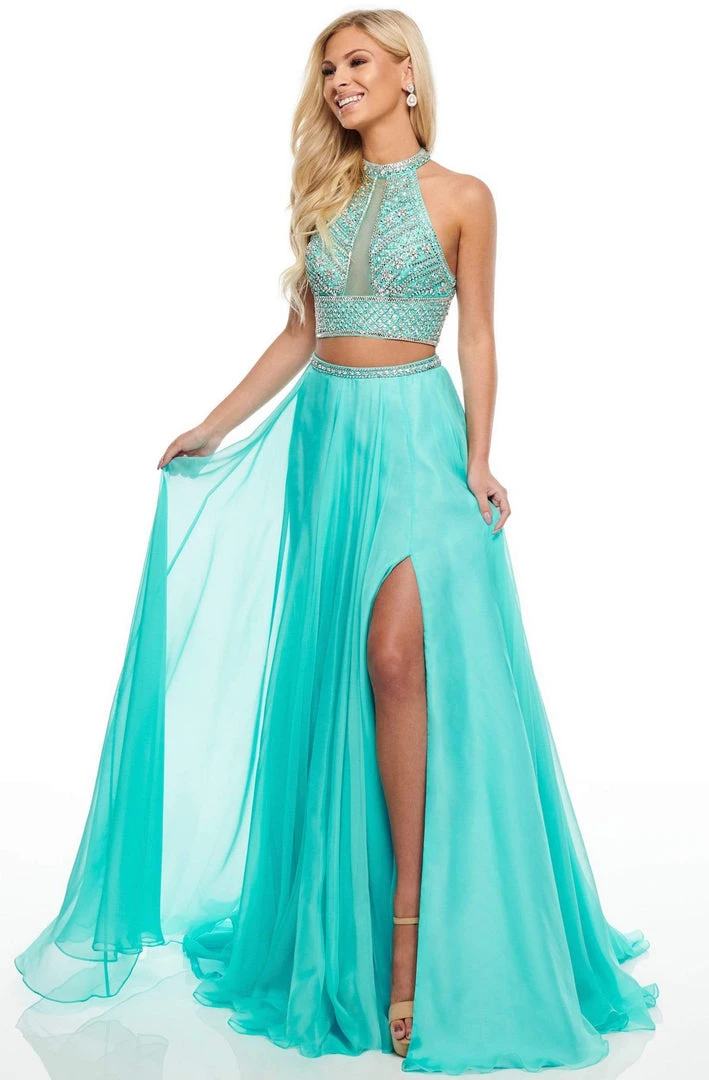 Be in this stunning Rachel Allan Prom 7034 masterpiece and have everyone talk about you. The crop top is embellished with striking stones that provide the perfect amount of glitz as you dance throughout the night. The a-line skirt crafted in flowy chiffon material that is sure to keep you relaxed. A thigh high slit in the skirt and back cutout detail add a fun and flirty effect. Beam with pride when you show up in this Rachel Allan Prom creation.