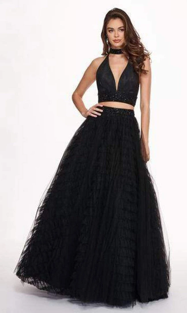 Time to flaunt those beautiful shoulders through its light Mikado halter top with beading along the choker and waistline. The front bodice features a deep cut-in at the center, while the back flashes with bare detail, with two fine straps. The ruffled soft tulle skirt cascades perfectly to the floor into a wide ballgown silhouette. Model is wearing Black color. Â