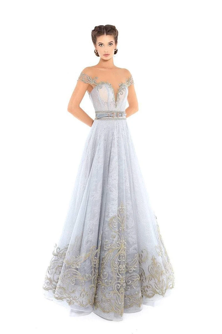 Walk the red carpet in style wearing this stunning evening gown by Tarik Ediz 93755. The fitted bodice offers an illusion bateau neckline over a distinct plunging off-shoulder lining. The natural waist is highlighted by a thin belt as it gives way to the pleated a-line skirt. Elegant lace appliques beautify this ensemble as it tapers to full length and reveals an illusion V back. This Tarik Ediz creation is simply captivating! Model is wearing Cloudy Blue color.