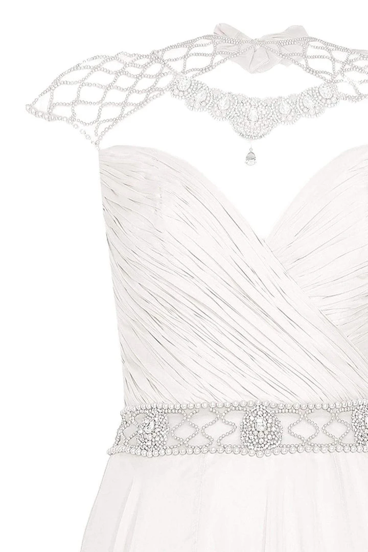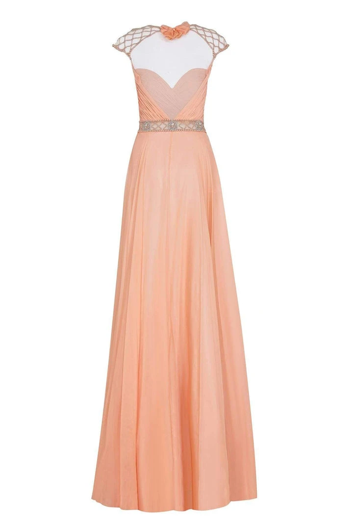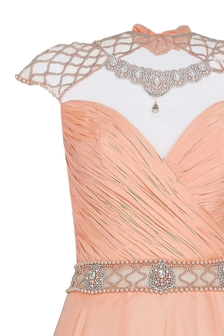 | Details: | Cap sleeves, Jewel accents, Sweetheart lining, Ruched bust, Jeweled waistband, A-line skirt, Sheer fabric |