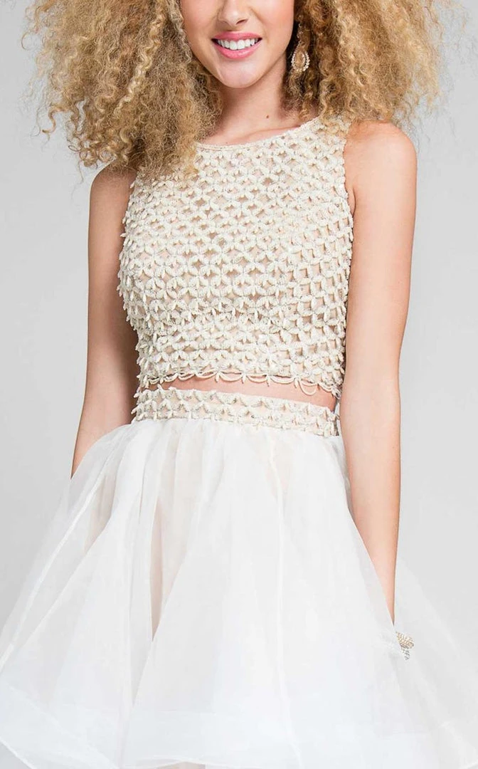 Get glamorous look with this dress by Terani Couture 1711P2688. Features a crochet-inspired diligent bead-work makes up the bodice of this sleeveless, two-piece designer dress from our prom collection. A sheer tiered, romantic organza skirt adds the sweeping ballgown appeal to this perfect dress for your high school prom night. You’ll definitely make a statement in every occasion when you wear this Terani Couture.