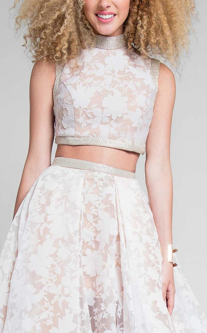Have all stares gravitate your way as you float to either your prom or homecoming event in this delicate two-piece set gown by Terani Couture Prom 1711P2713. The stunning ensemble shows a high collared neckline and sheer open back. Bundled beads trim the armhole and the entire midriff. Large floral appliques decorates the top and a full high-low ruffled skirt finishes the look. Be extra alluring when donned with this dainty Terani Couture masterpiece.
