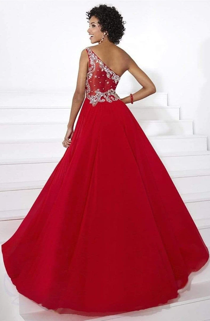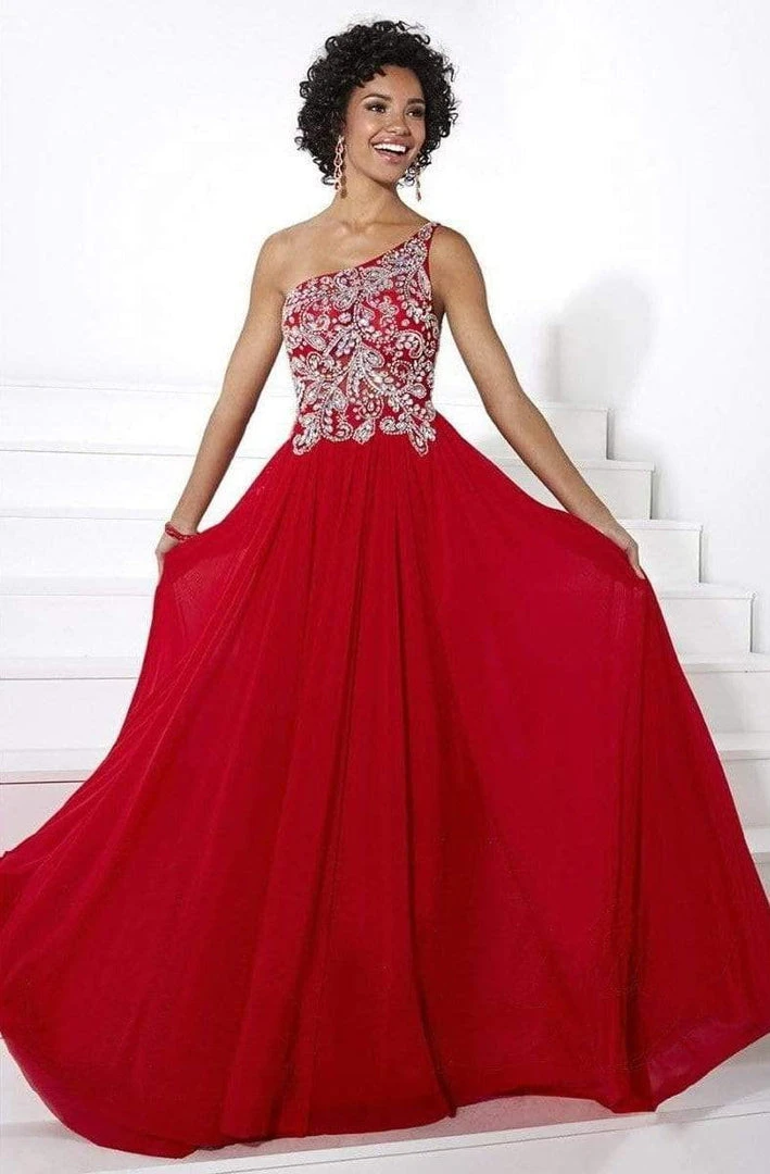 Make an unforgettable entrance in this asymmetrical one-shoulder gown by Tiffany 16089. The Illusion bodice is decorated with AB rhinestones in a breathtaking pattern. The waist and sheer back are lined with the same elegant beading detail, and the full skirt is made of stretch net, with a sweep train and side zipper. Tiffany Designs presents outstanding, classy designs for prom, homecoming, or any special occasion.