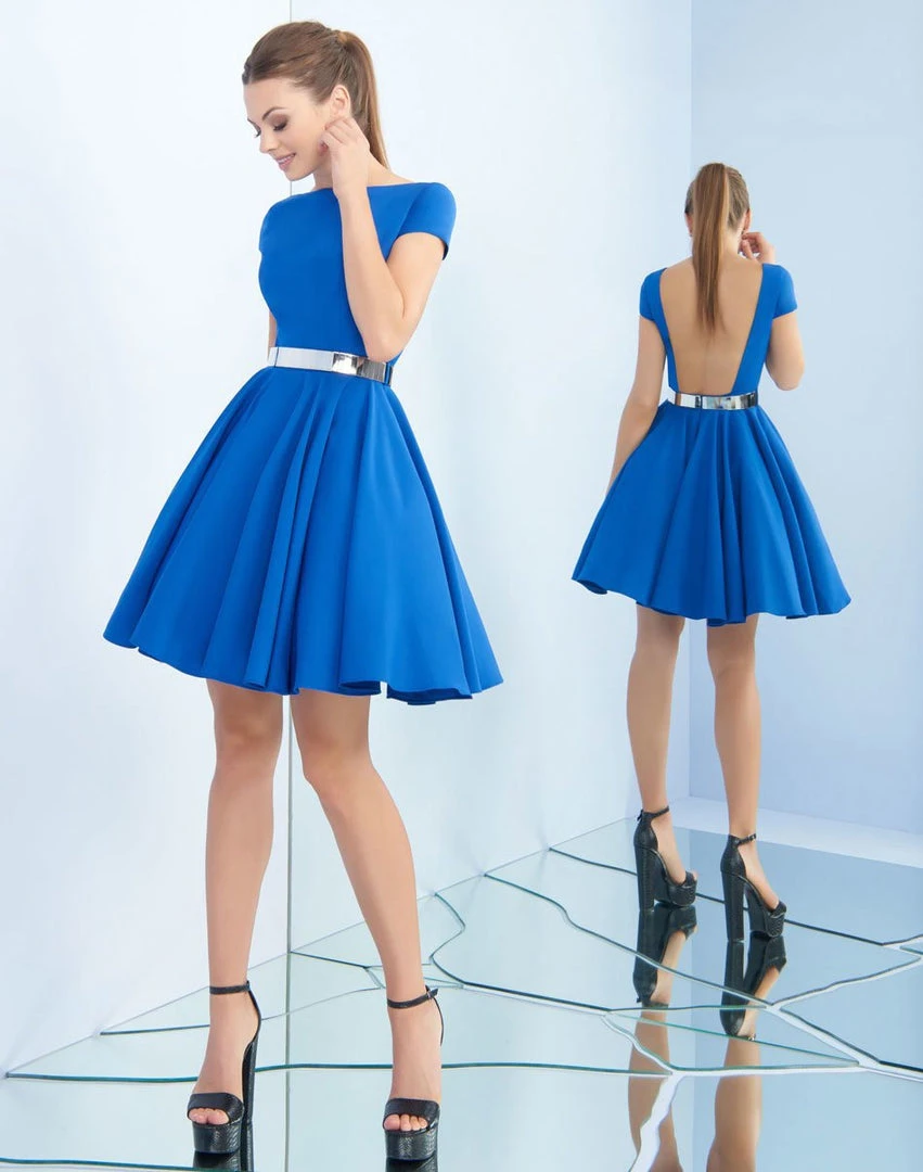 | Details: | Stretch Crepe, Cap Sleeves, Metallic Belt, Plunging Square Cut Back, Back Zipper Closure, Short Hem |