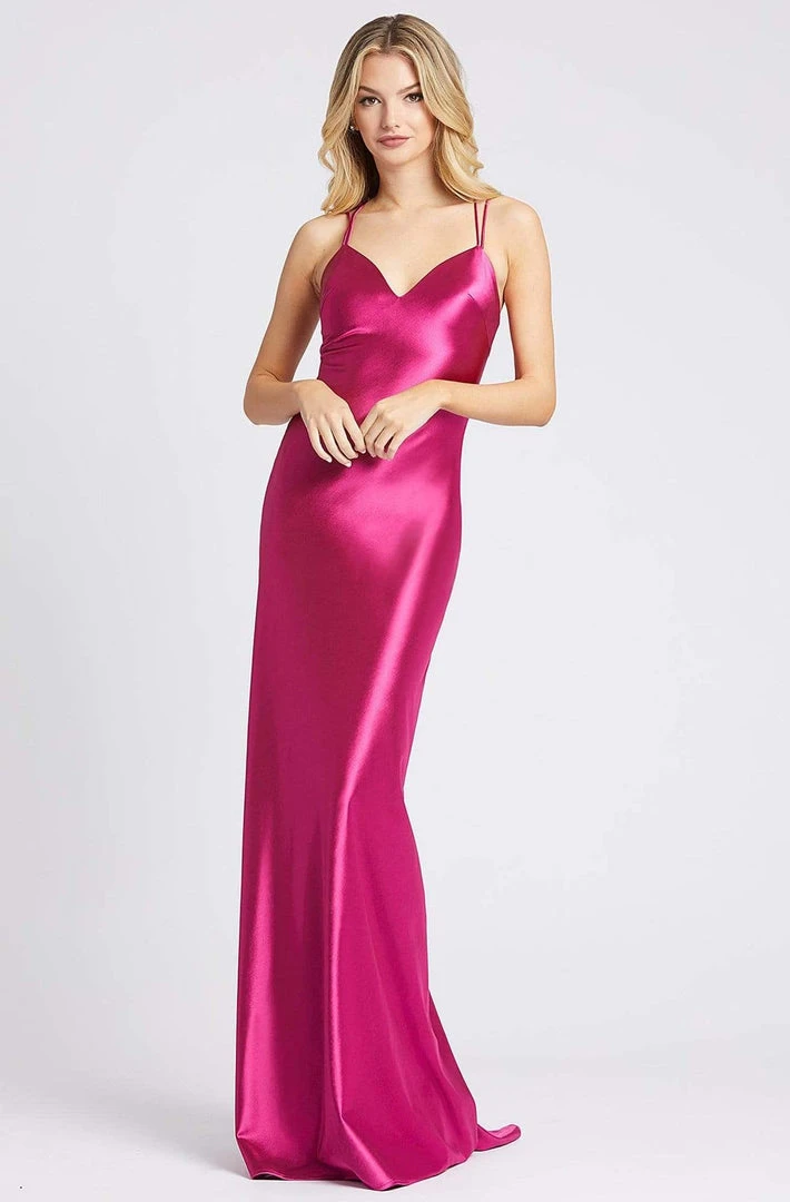 Set yourself apart from the opulent crowd in this timeless Ieena Duggal 26263I creation. Sleekly rendered with seams on a rich satin fabric, this gown shows a v-neckline with double spaghetti straps. Stringed with crisscrossing straps on a tie-bandeau back, the sheath skirt streams into a gleaming length with a train. Have all eyes gravitate towards you in this Ieena Duggal masterpiece.