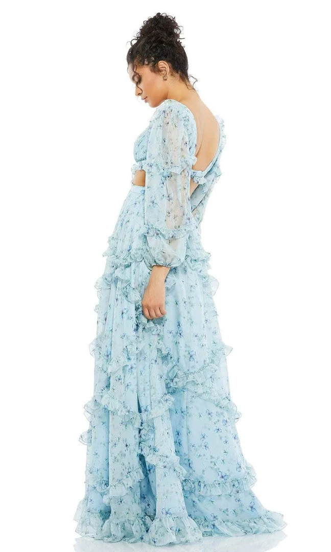 Be fabulous and get ready for everyone to stop and stare when you show up in this beautiful gown by Mac Duggal 67949. Be enchantingly beautiful as you wear this ruffle-rich dress with prints of flower throughout. It has tiered style and a flowy A-line silhouette in full length that even runs with a sweep train finish. Has side cut outs and an open back style. This Mac Duggal dress is specially designed to make that special occasion worth reminiscing.