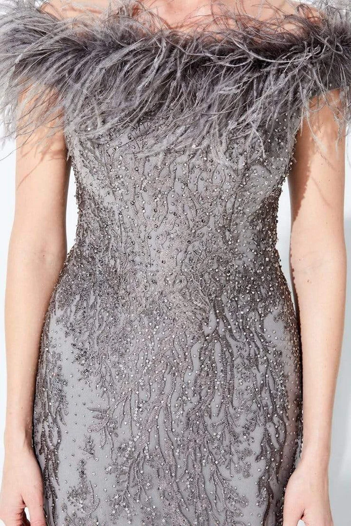 Look fantastic for your next formal event in this evening gown by Ivonne D by Mon Cheri 220D22. This novelty embroidered gown features an off-shoulder fit with a straight neckline and a fit and flare skirt. Stone accents are all over the dress with a sweep train. Feather boa is included in the set. This Ivonne D by Mon Cheri creation is simply captivating!