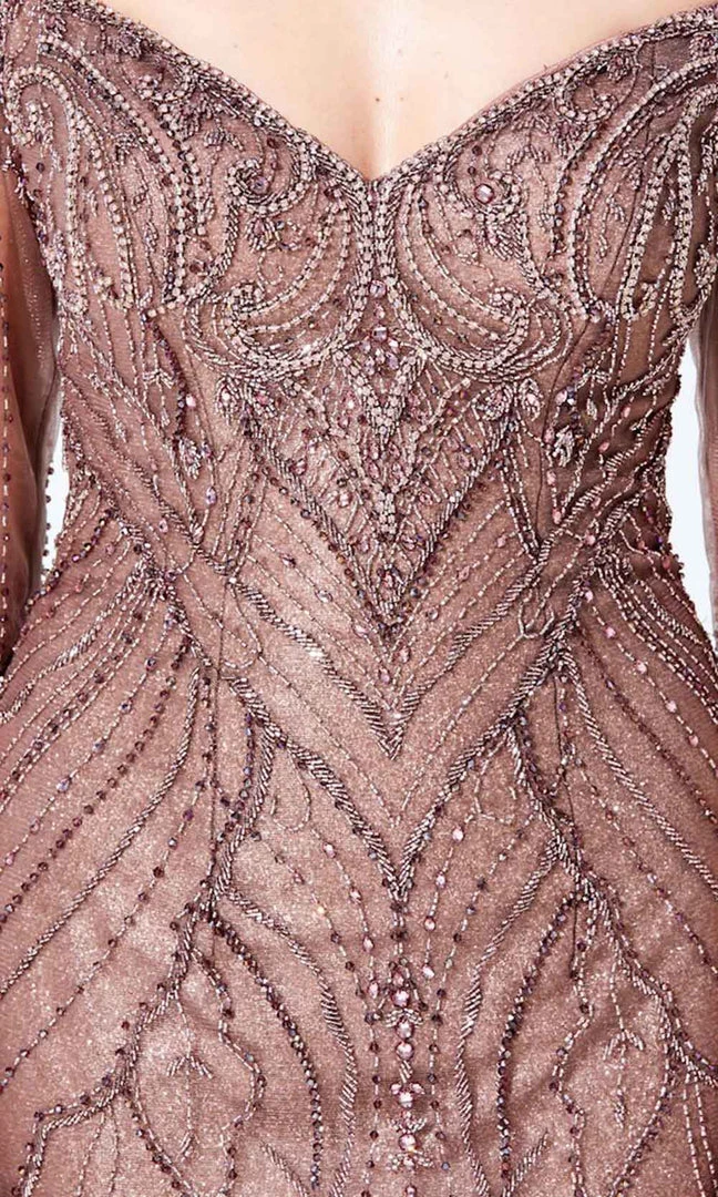 | Details: | Illusion quarter length sleeve, V-neck, Metallic glitter pattern, Embellished bodice, Zipper back, Sweep train, Shawl included |