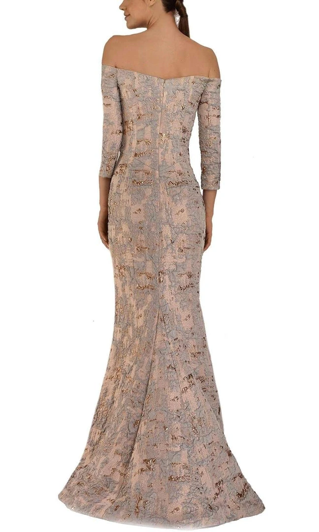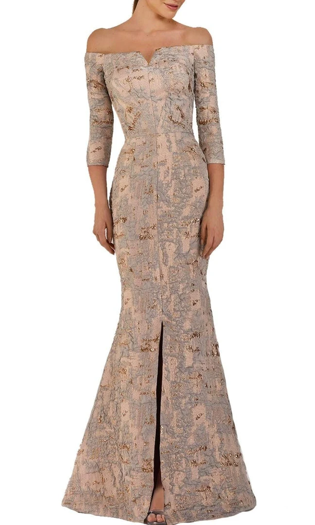 Render them speechless in the fascinating elegance brought by this Janique 67721 creation. Crafted with contouring seams on a metallic accented jacquard fabric, this gown flourishes an off shoulder neckline with a v-notch. Designed with slender quarter sleeves and a mid-open back, the skirt opens with a front slit that subtly flares from the knees and ends with a sweep train. Express a signature style that speak of elegance in this Janique masterpiece. Model is wearing the Champagne color.