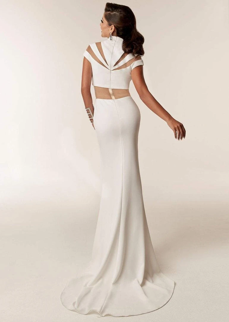 | Details: | Jersey, Cap sleeves, Sheer panels, Sheath skirt, Slit, Back zipper, Sweep train |