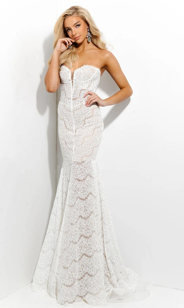 | Details: | Strapless, Sheer inset, Beaded, Sheer lace fabric, Sweep train, Center zipper closure, Mid-open back |