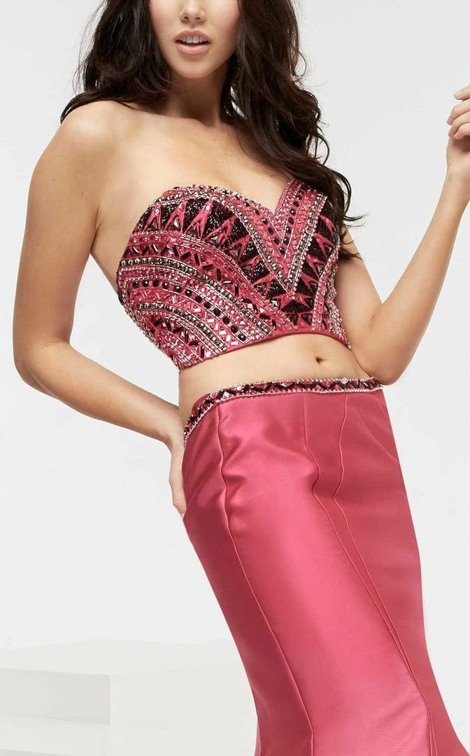 | Details: | Two-piece, Strapless, Beaded, Open back |