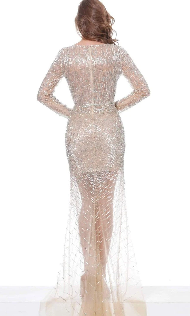 Strike a pose as you enter the room in this exquisite dress from Jovani 02497. This beaded masterpiece appeals in a plunging V neckline with long sleeves. It has a form-fitting bodice and a back zipper closure. The skirt is tailored in a fit and flare silhouette and has a slit and sweep train finish. Standout among the fabulous crowd as all eyes focus on you in this glamorous Jovani creation. Model is wearing Nude color.