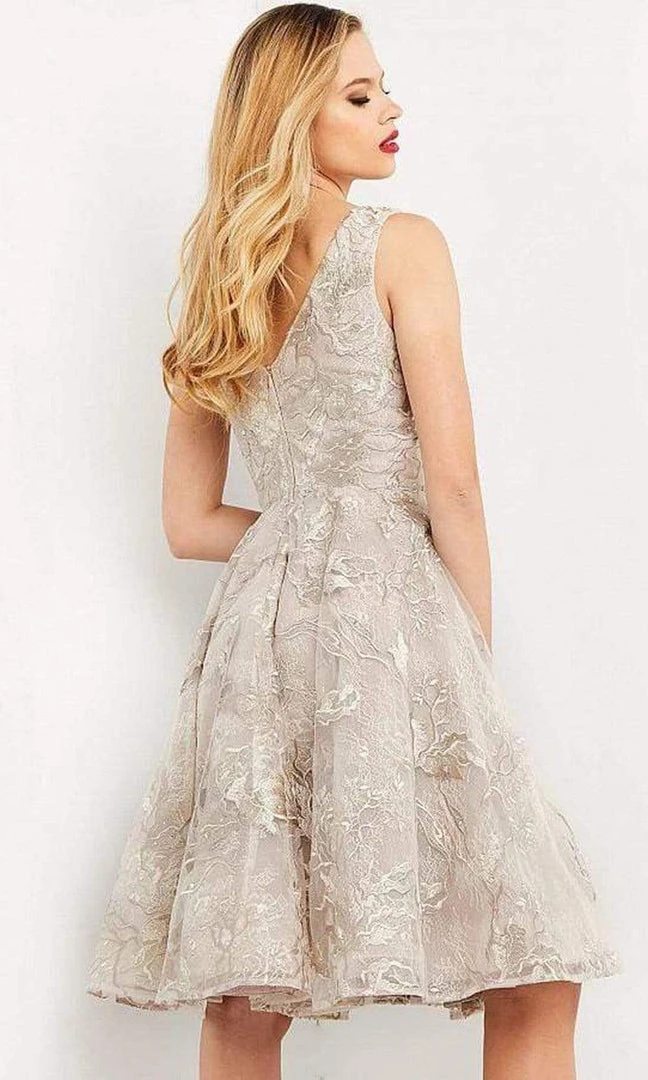 Glide into that spectacular black-tie event like an ethereal vision as you flaunt this gorgeous Jovani 04442. A tea length dress that parades a plunging neckline with a sheer panel and a sleeveless. This dress is embroidered with floral pattern and it is fit and flare. The skirt is a gathered type of skirt for a more flowy and for a strikingly gorgeous walk. It has a scoop back and a back zipper for closure. This stunning short Jovani creation dress brings together all the essentials for a great look at prom or party! Model is wearing Champagne color.