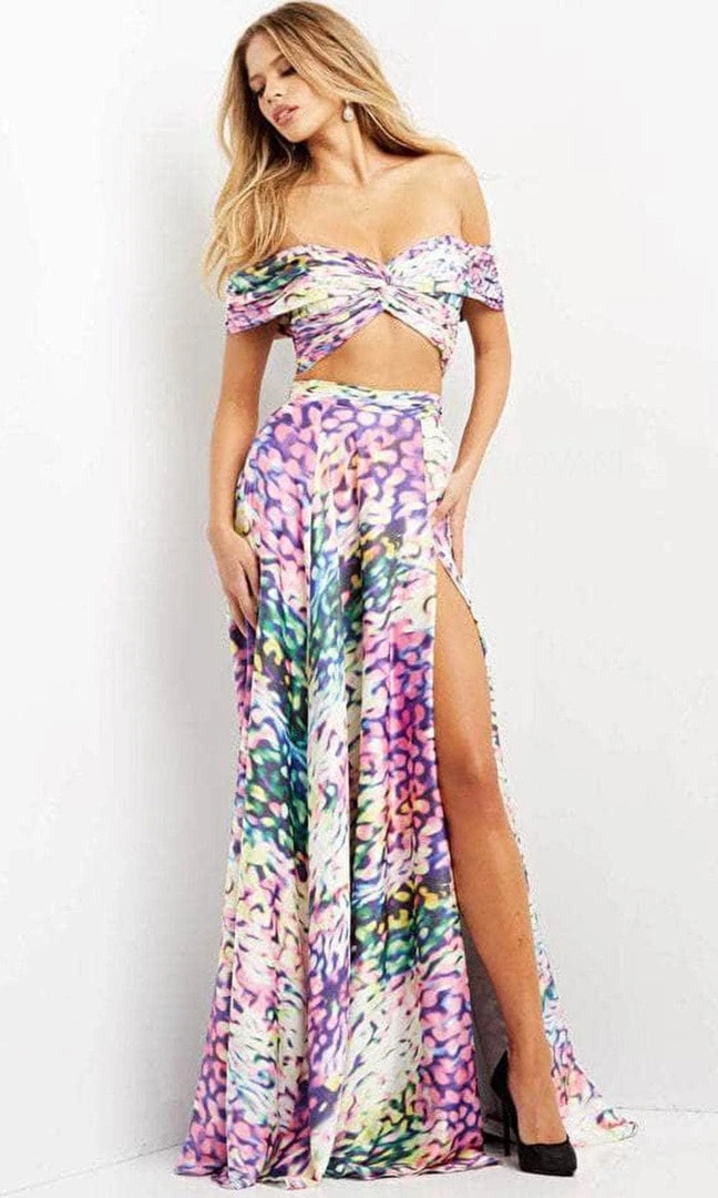Have fun in this fashionable and eye-catching Jovani 08350 creation. This two-piece dress pleases in an off-shoulder neckline bandeau top showcasing a glimpse of skin. It has a mid-open back and secured with a zipper closure. Tailored in a fascinating color, the skirt flourishes in an A-line silhouette and runs smoothly in a full-length hemline and complemented with a thigh-high slit. Chill-ax and enjoy the party with this Jovani creation. Model is wearing Multi color.
