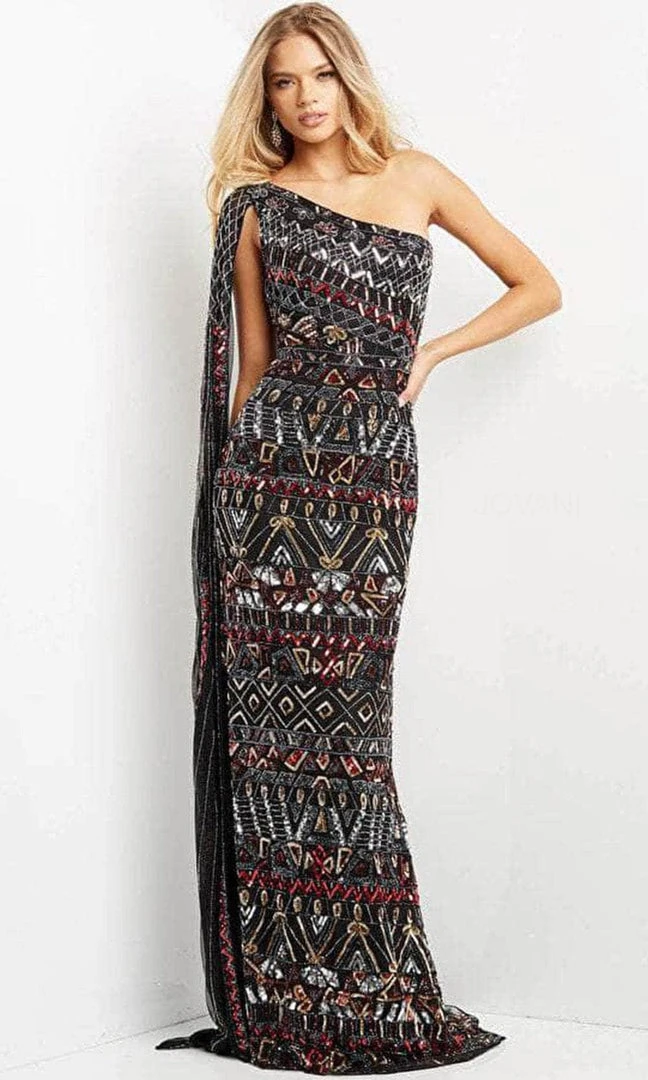 Look your absolute best and create a night that you will never forget wearing this Jovani 08450. Intricately adorned with sequins and beads all throughout, this stellar piece features a fitted bodice with an asymmetrical neckline, supported with a single shoulder strap with a fully embellished shoulder cape. The skirt smoothly clings to the hips as it beautifully cascades to the floor, completed with a brush of train. Everyone who sees you will be left speechless and giddy in this Jovani creation. Model is wearing Black/Multi color.
