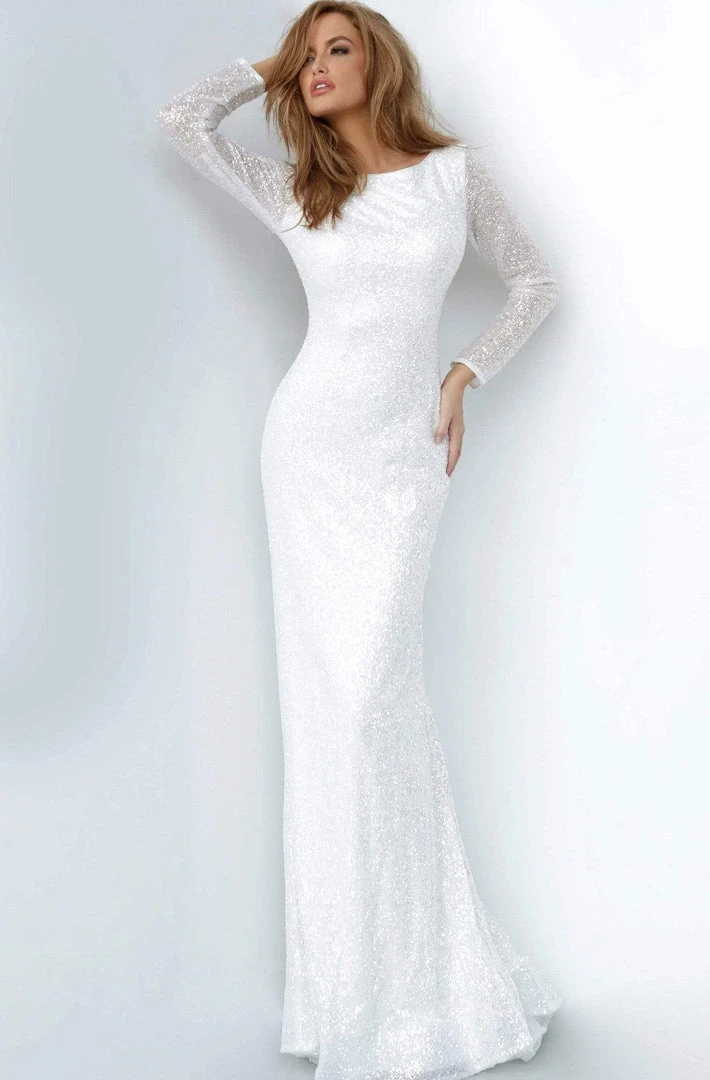 Be the center of attention in this glamorous Jovani 2927. Tailored with bateau neckline, this beauty is gracing long sleeves, glitter details all over, and a zipper closure. The sheath silhouette skirt features a horsehair hemline. Shine with the glow of ever after in this mesmerizingly Jovani creation. Find more evening dresses!