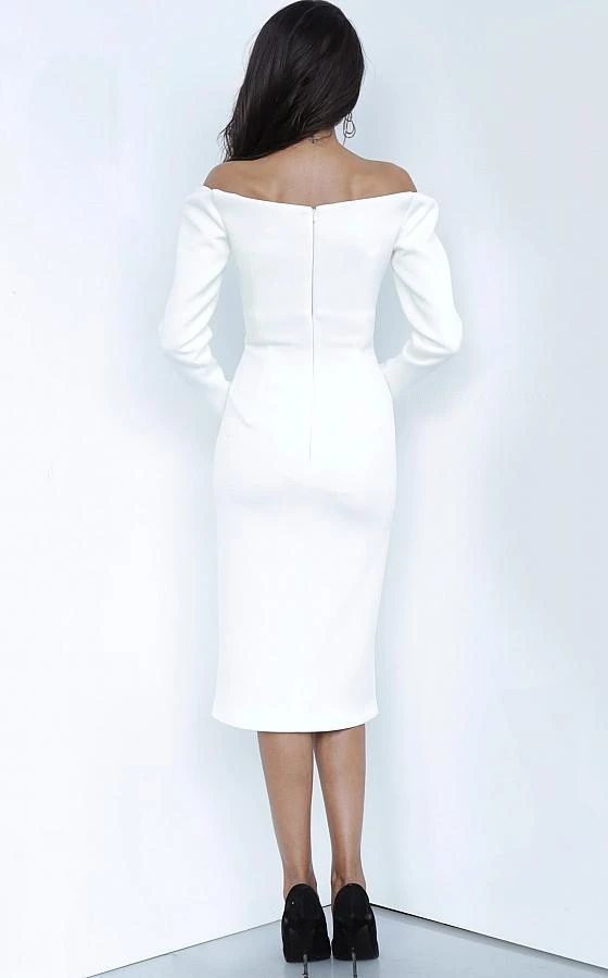 Parade your classy side when you show up in this stunning Jovani 3570 cocktail dress. The fitted bodice showcases an off-shoulder neckline with sweetheart notched detail and long sleeves. Button accents design the bodice as a front slit accents the skirt for ease of movement. This Jovani ensemble is simply captivating. Model is wearing White color.