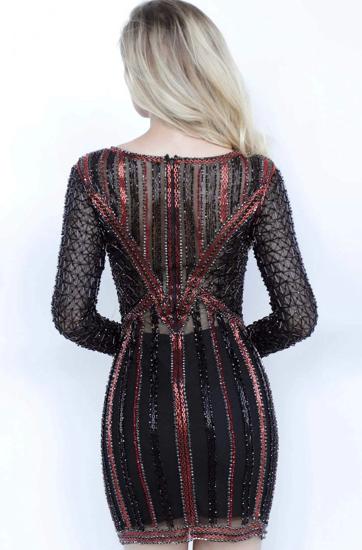 Sizzle all night in this fabulous dress by Jovani 68478. This embellished cocktail dress features a bateau neckline with long sleeves. The dress has a figure-flattering bodice and completes the look with a mid-thigh fitted skirt. Get the party started in this spectacular dress from Jovani.