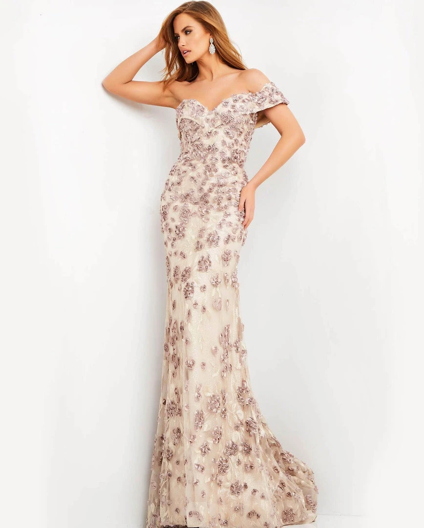 Sculpted in a sleek lace silhouette with tiny rosette appliques, this gown charms with a sweetheart neckline with a foldover accent and an off-shoulder strap. Streaming with a bouquet of adornments, the skirt reveals a mermaid silhouette with a train. Model is wearing the Latte color.