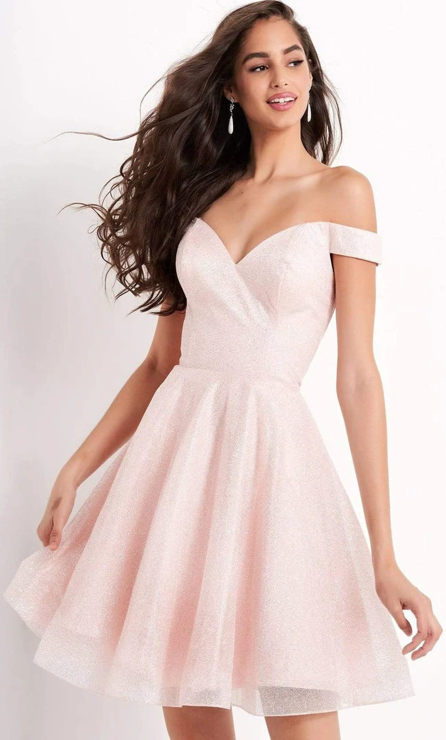 Dance the night away in this Jovani JVN04639SC creation. Designed with a textured glitter fabric, this dress flaunts an off shoulder neckline with a v-notch and a midrise back. The A-line skirt cascades into a short dainty hemline. Envelope yourself in this whimsical Jovani masterpiece. Model is wearing the Pink color.