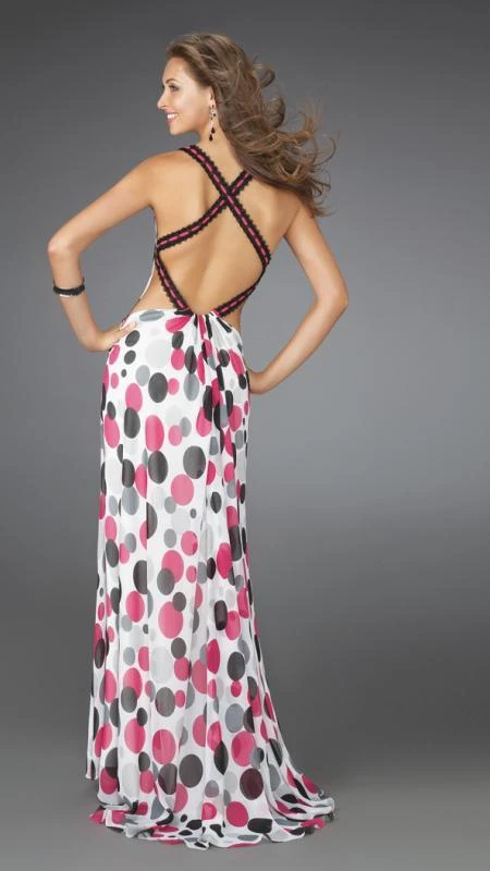Make your grand entrance in this stylish La Femme 14403. Printed dress with criss cross back. This La Femme style gives you superb look for your evening occasion.