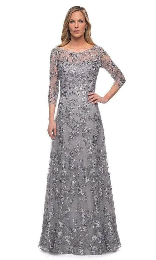 This formal modest dress features a sheer quarter sleeves and jewel neckline. It has floral embroidery allover and then parades a sweep train in an A-line silhouette. This dress uses back zipper to close. Model is wearing Silver color.