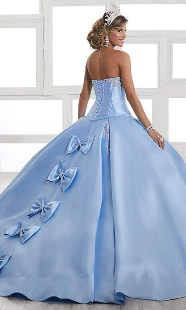 | Details: | Strapless, Corset Bodice, Corset Back, Pleated Skirt, Beaded Appliques, Ribbon Accents, Court Train |
